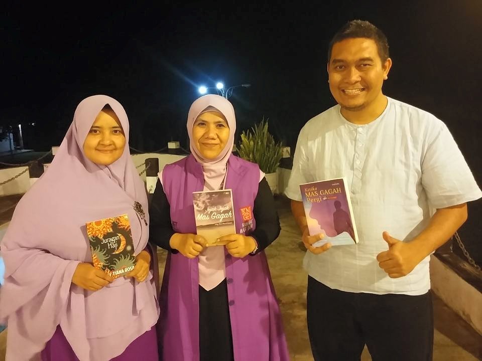Senang banget jumpa pasangan suami istri inspiratif ini, Pak Yunan Harahap dan Bu Sakinah. Mereka bilang sejak kuliah kerap membaca karya-karya saya termasuk KMGP. Selain mentraktir makan ikan bakar, beliau spontan ikut ’patungan bikin film’ dalam bentuk cek. Beliau bertekad menyisihkan 10% keuntungan dari tiap penjualan Pia Saronde, oleh-oleh khas Gorontalo yang sangat terkenal, yang mereka kelola. “Saya juga siap booking 1 bioskop penuh di Gorontalo untuk film Ketika Mas Gagah Pergi,” tutur Pak Yunan.