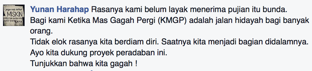 Malamnya saya baca komentar beliau tentang film Ketika Mas Gagah Pergi dari Facebook. Beliau menulis: “Bagi kami, KMGP adalah jalan hidayah banyak orang. Tak elok rasanya kita berdiam diri. Saatnya kita menjadi bagian di dalamnya. Ayo kita dukung proyek peradaban ini. Tunjukkan bahwa kita gagah!”