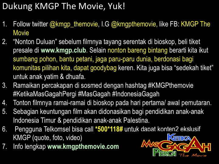 “Nonton Duluan” sebelum filmnya tayang serentak di biosko dengan membeli tiket presale di http://www.kmgp.club. Selain nonton bareng bintang berarti kita ikut sumbang pohon, bantu petani, jaga paru-paru dunia, berdonasi bagi komunitas pilihan kita, dapat goodybag keren. Kita juga bisa “sedekah tiket” untuk anak yatim & dhuafa.